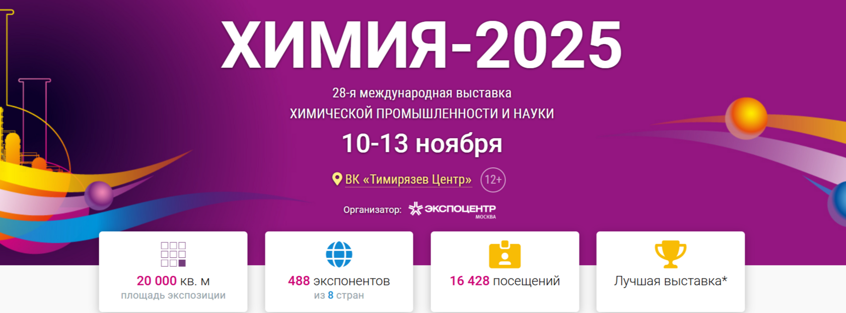 Приглашаем Вас на международную выставку химической промышленности и науки ХИМИЯ 2025, которая пройдет с 10 ноября по 13 ноября 2025 г. в ВК "Тимирязев Центр" (г. Москва, Верхняя аллея, д. 6, стр. 1).